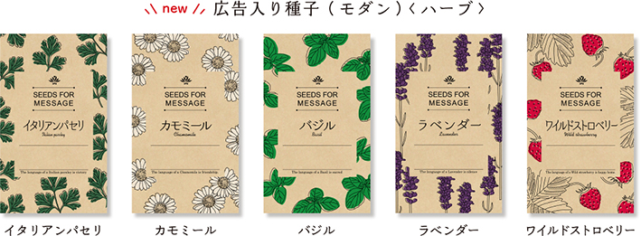広告入り種子(モダン)とThank you seed(名刺型)にハーブのラインナップが仲間入りしました。 広告入り種子(モダン)〈ハーブ〉はこちら